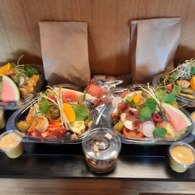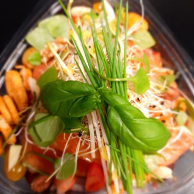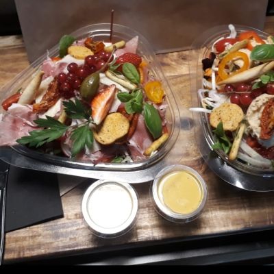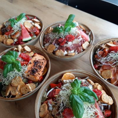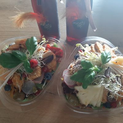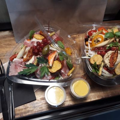 VERZORGDE SALADES MET DAGVERSE GROENTEN, GARNITUREN, DRESSING & ZAKJE RUSTIEK HOUTHAKKERSBROOD